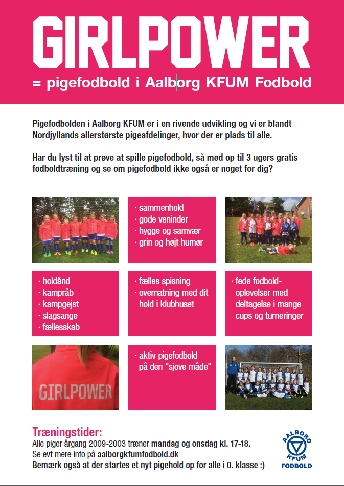 Alle piger i 0. og 1. klasse inviteres til GRATIS fodboldtræning resten af efteråret i Aalborg KFUM. Vi træner hver mandag og onsdag fra kl. 17-18 og hvis du har lyst til at prøve at spille fodbold, så møder du bare op ved Multibanen på træningsanlægget. Vi ses